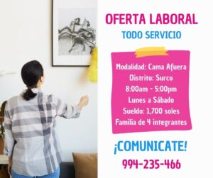 Modalidad: Cama adentro Distrito: Surco 8: am – 5:00 pm Lunes a Sábado Sueldo:1700 soles Familia de 4 integrantes